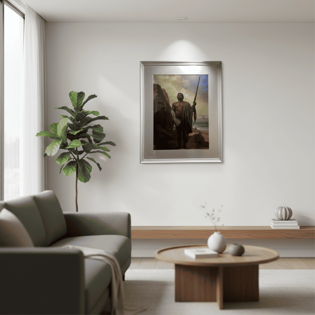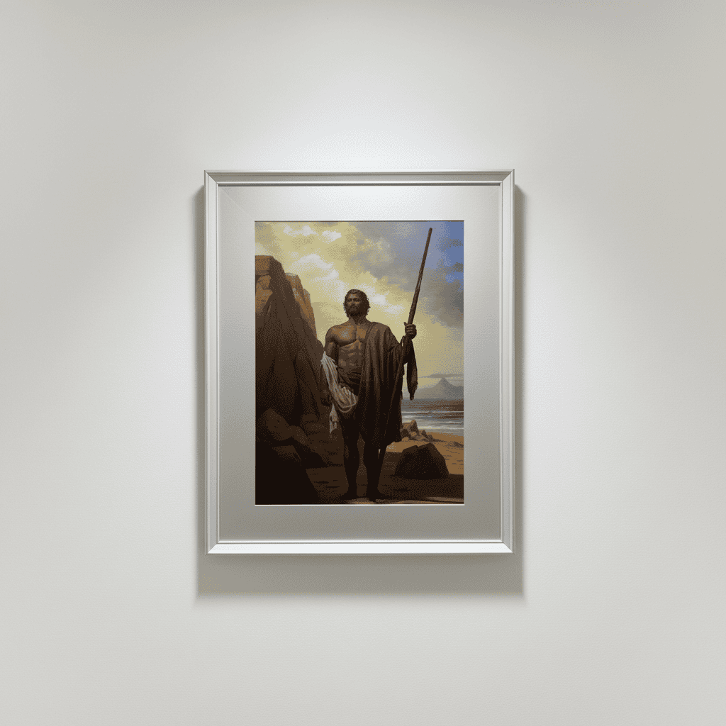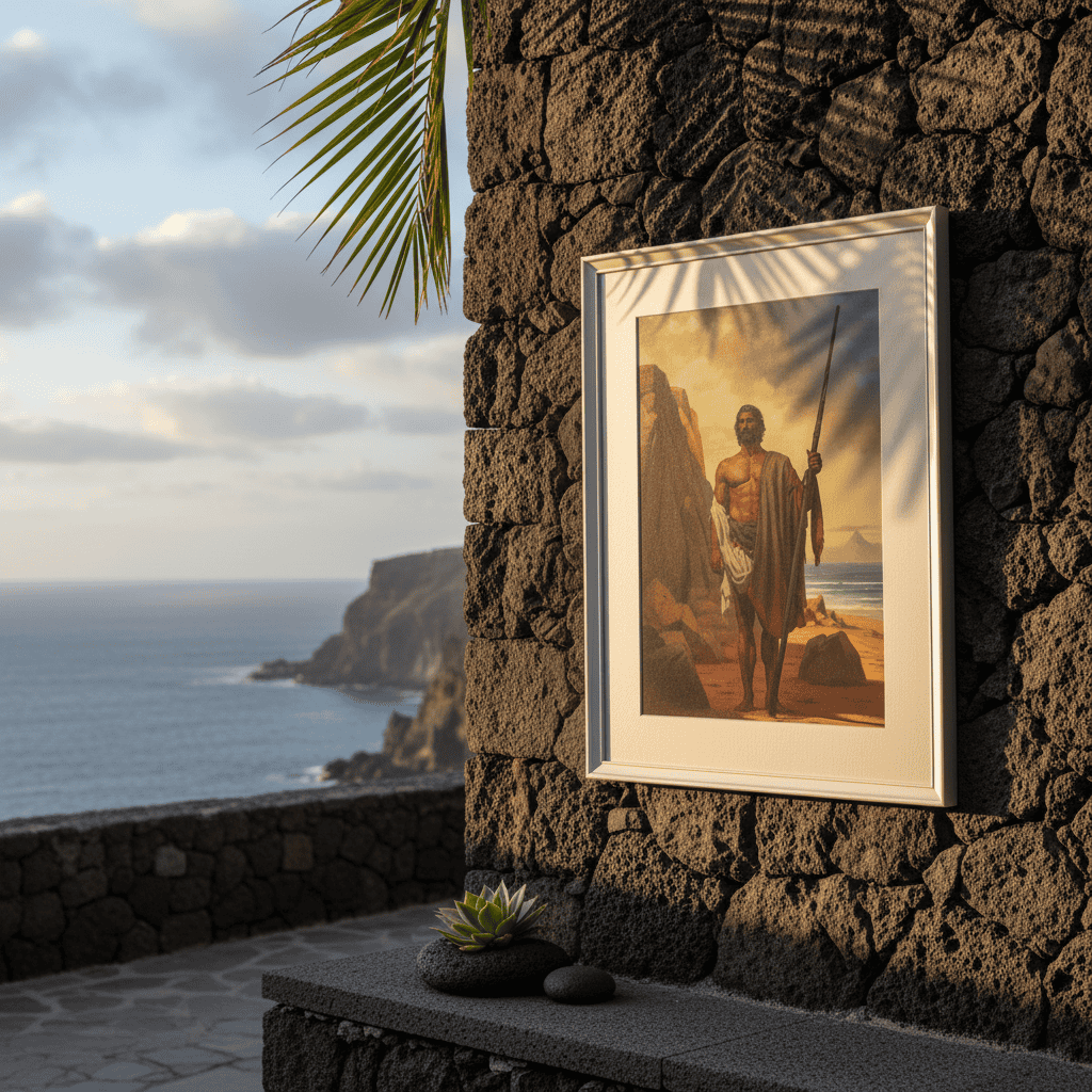 Dieses digitale Gemälde auf Leinwand zeigt den Mencey Adjoña, den Herrscher von Abona. Es ist eine Hommage an die Ureinwohner Teneriffas und bringt kulturelle Tiefe in jeden Raum.