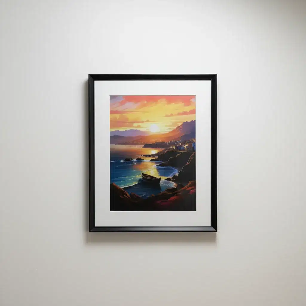 Diese digitale Leinwand fängt die Ruhe eines Sonnenuntergangs an den Küsten unserer Insel ein und verbindet modernes Design mit Inselflair.
